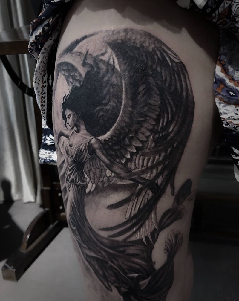 大天使纹身图片_腿部欧美写实纹身图案