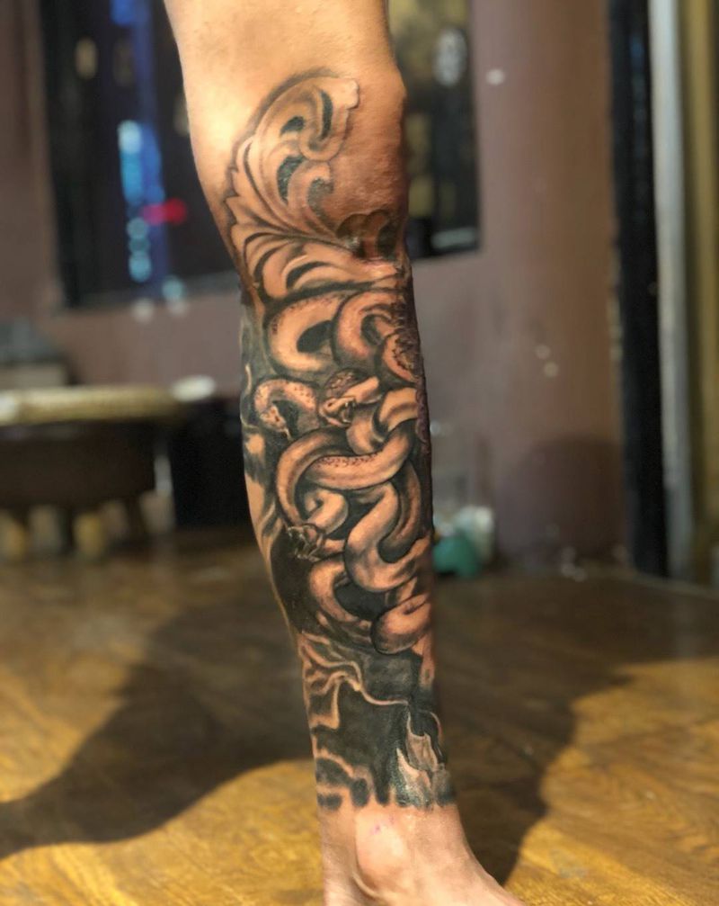 • T网红王老大花腿龙纹身图片_腿部新传统纹身图案