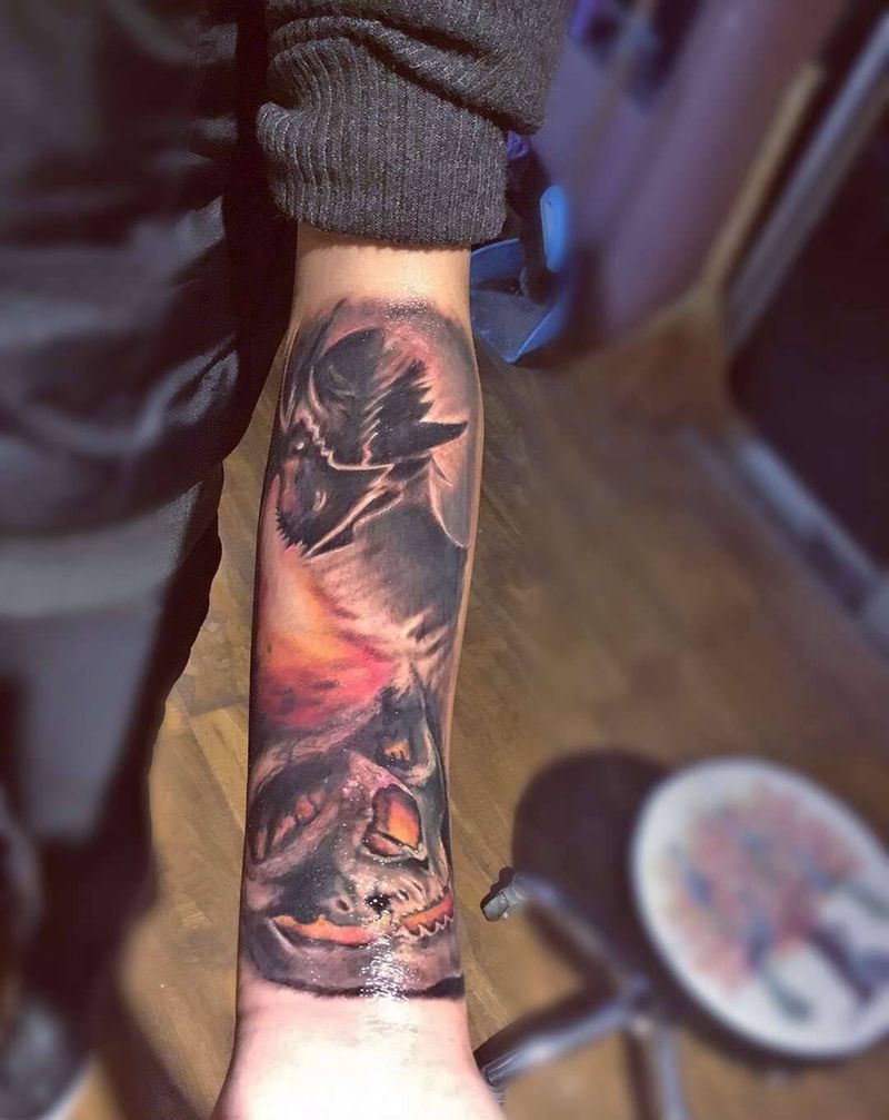 当前位置: 首页 >山东省济宁市纹身店-湛刺青纹身图案>龙与骷髅纹身图片_手臂欧美写实动物鬼神成品纹身图案