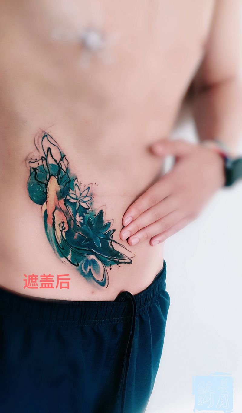 锦鲤,遮盖纹身图片_腹部水彩水墨纹身图案