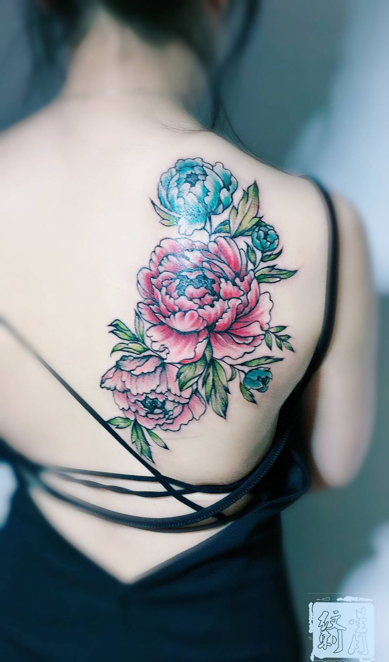 素花,彩色纹身图片_背部点刺水彩纹身图案