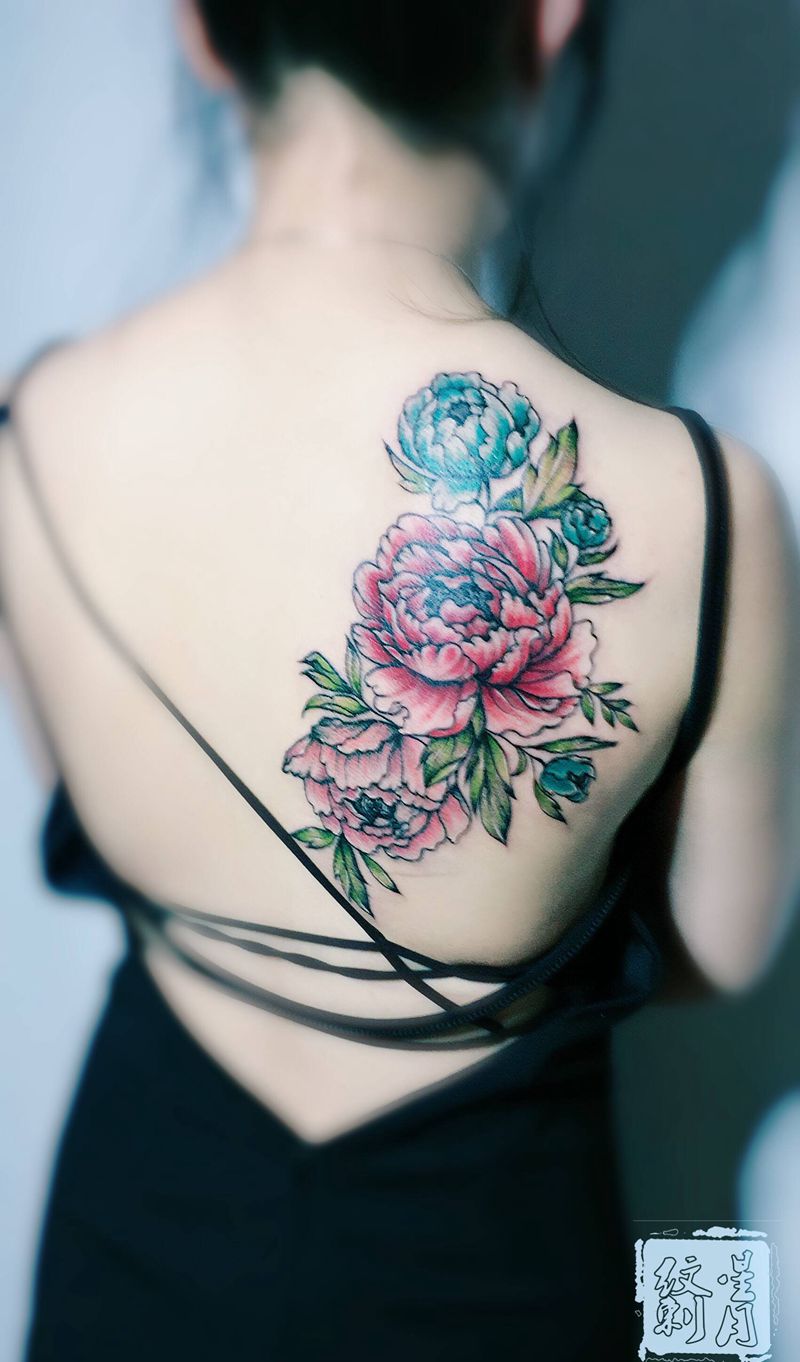 素花,彩色纹身图片_背部点刺水彩纹身图案