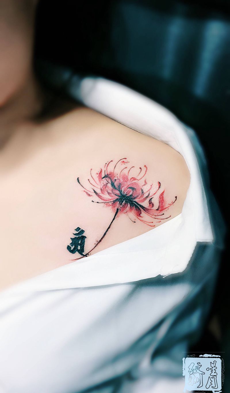 彼岸花纹身图片_胸部水彩水墨纹身图案