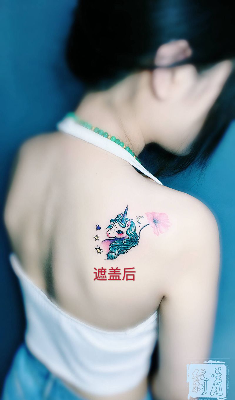 独角兽遮盖字母纹身图片_背部水彩New School纹身图案