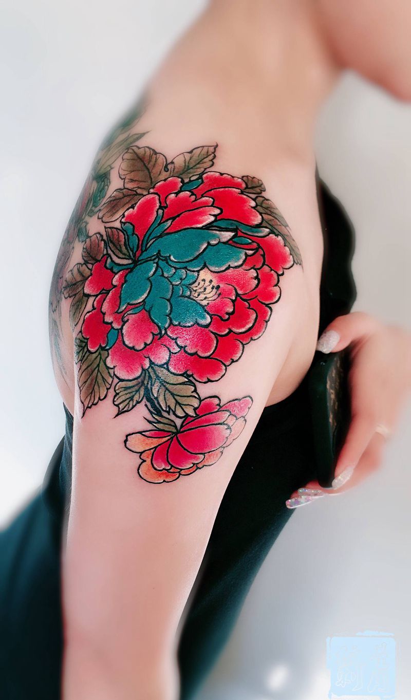 当前位置: 首页 >山东省潍坊市纹身店-星月纹刺纹身图案>牡丹纹身图片_手臂肩部新传统水彩纹身图案
