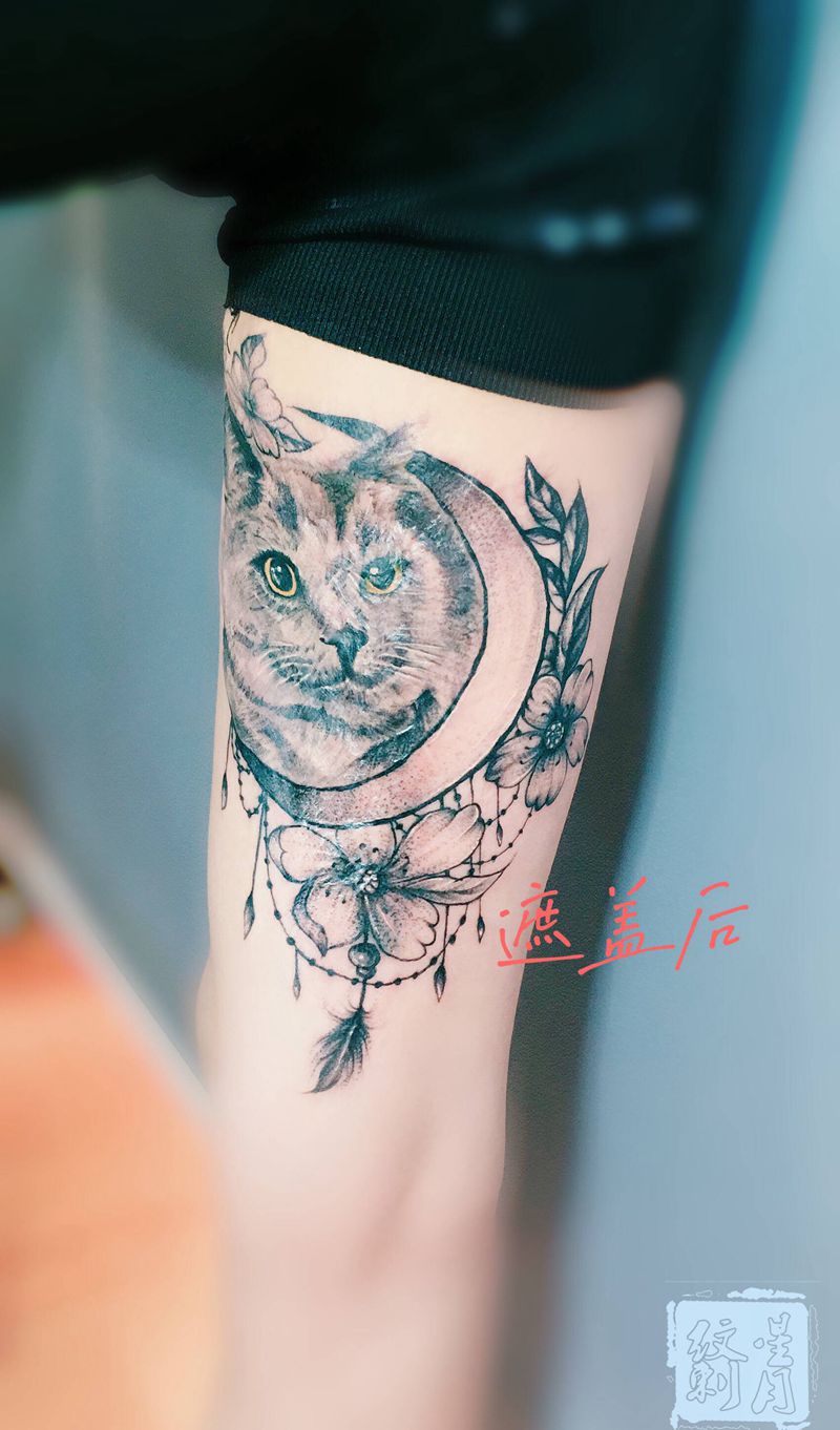 猫,疤痕遮盖纹身图片_腿部点刺图腾纹身图案