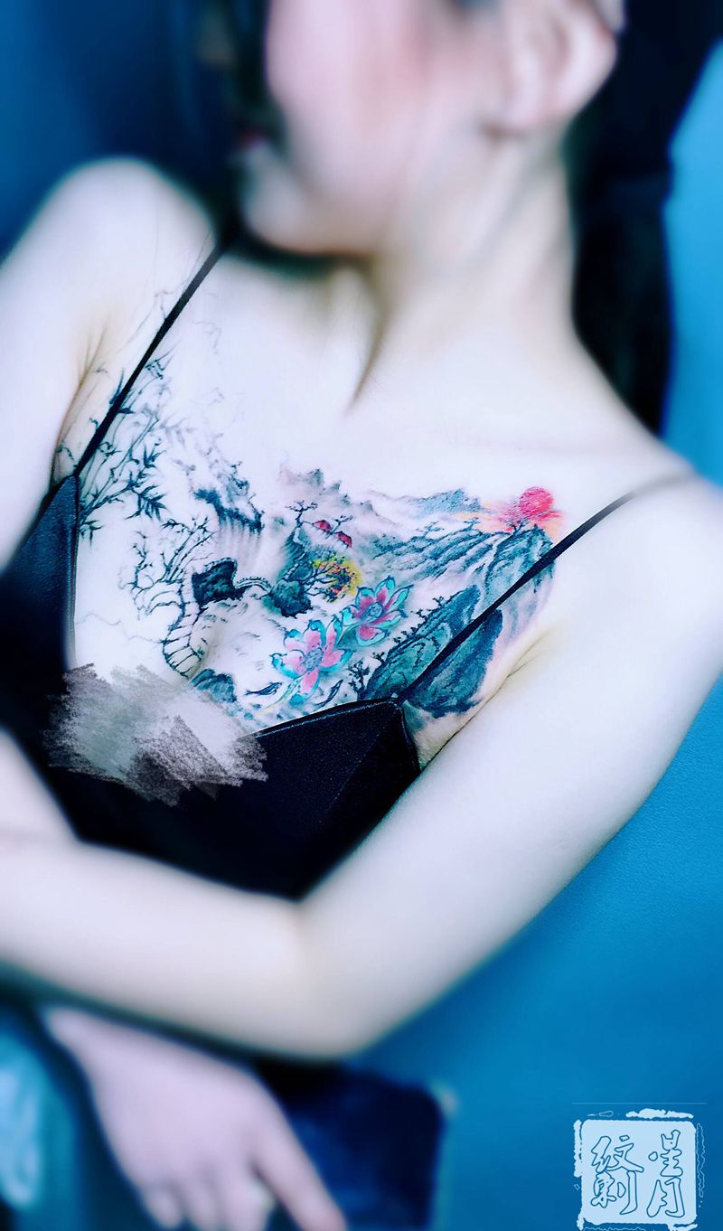 添加,升级纹身图片_胸部水墨水彩纹身图案