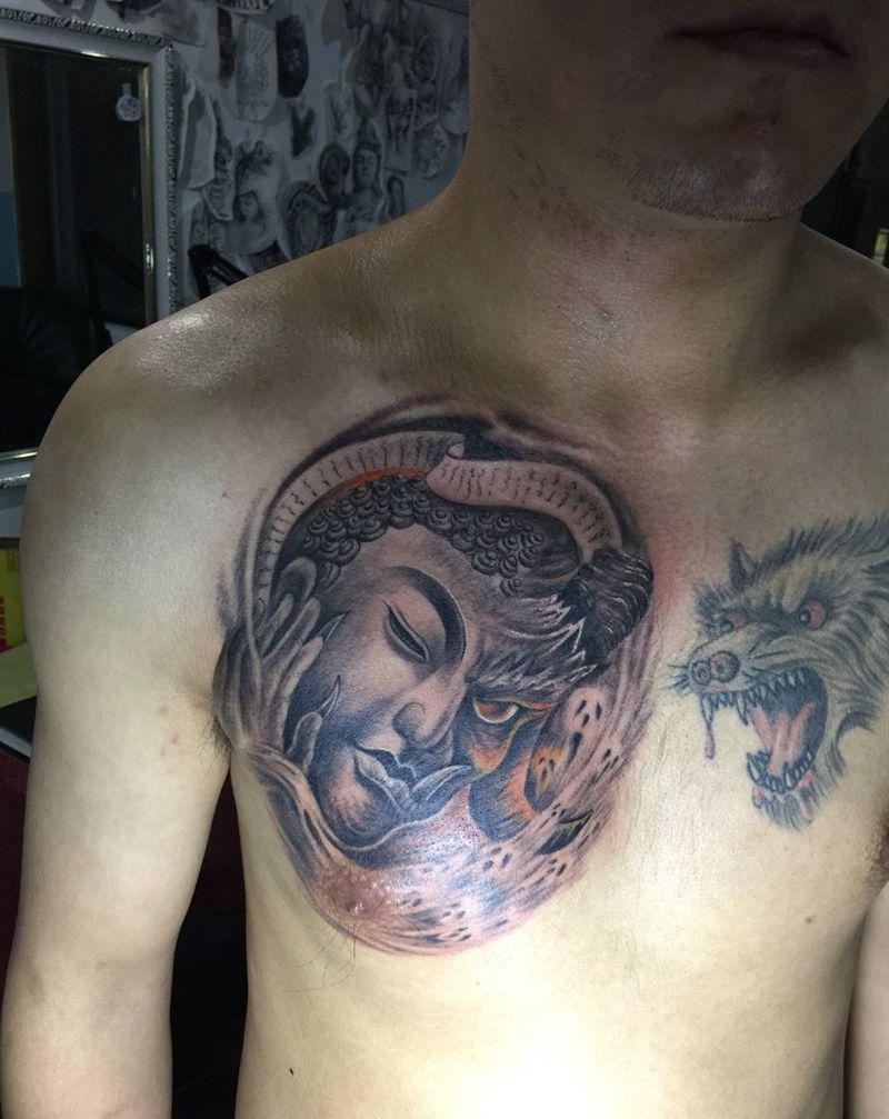 当前位置: 首页 >山东省潍坊市纹身店-星月纹刺纹身图案>佛与魔一念间纹身图片