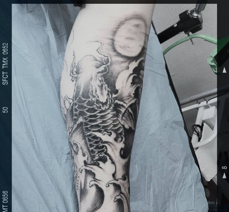 当前位置: 首页 >山东省潍坊市纹身店-星月纹刺纹身图案>鲤鱼,包小腿纹身图片