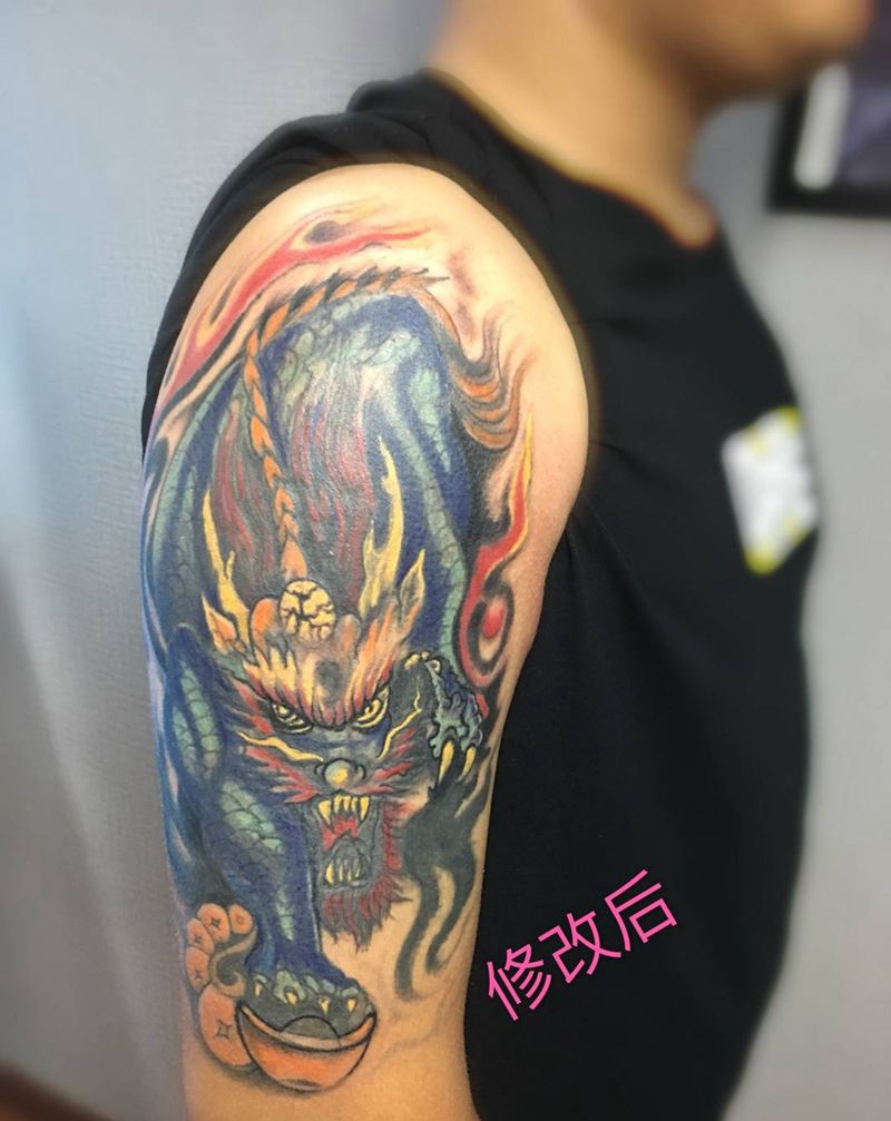 • T网红王老大花腿龙纹身图片_腿部新传统纹身图案