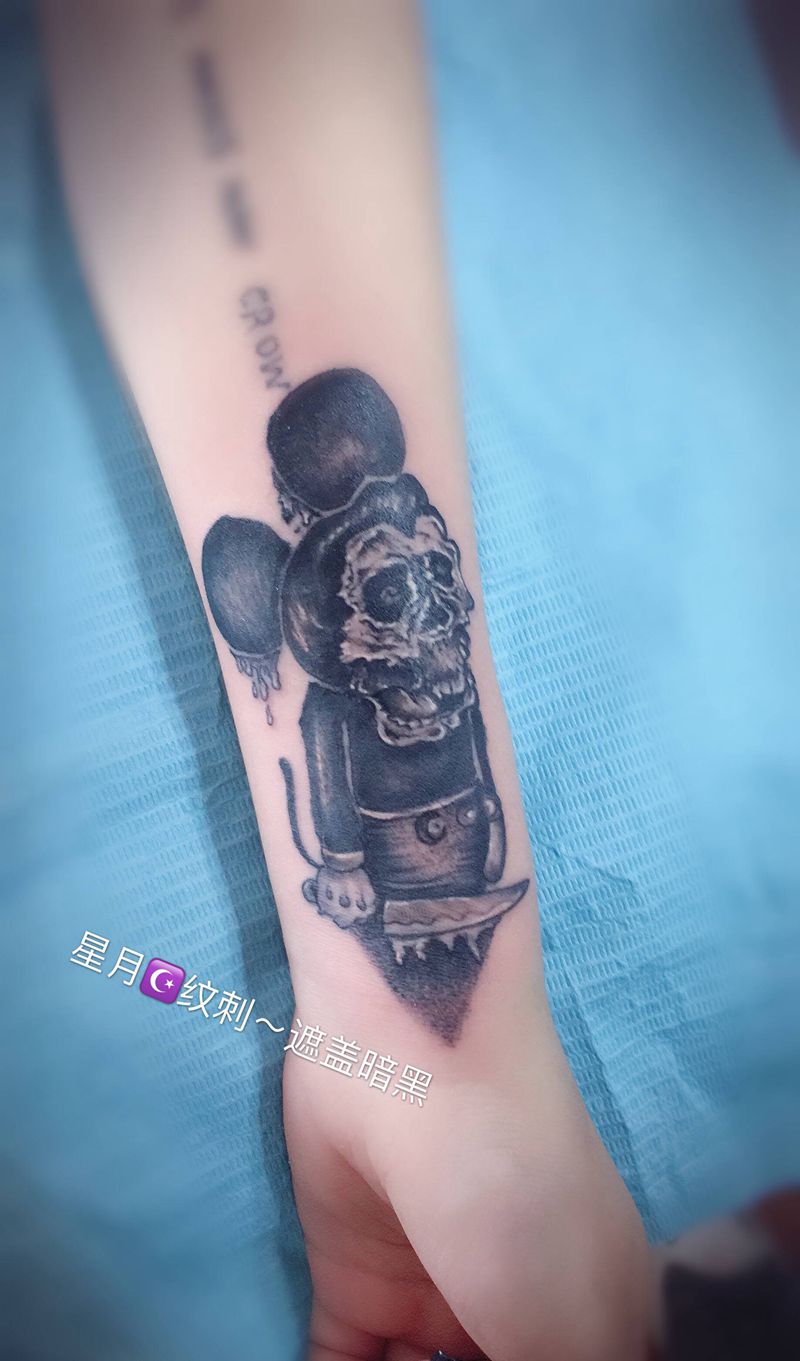 当前位置: 首页 >山东省潍坊市纹身店-星月纹刺纹身图案>暗黑米老鼠纹身图片_手臂纹身图案