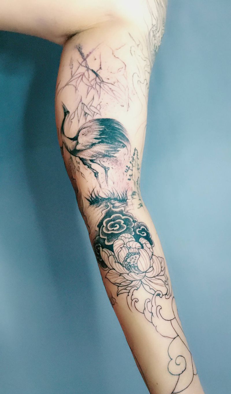 当前位置: 首页 >山东省潍坊市纹身店-星月纹刺纹身图案>九分花臂衔接纹身图片_手臂老传统水墨纹身图案