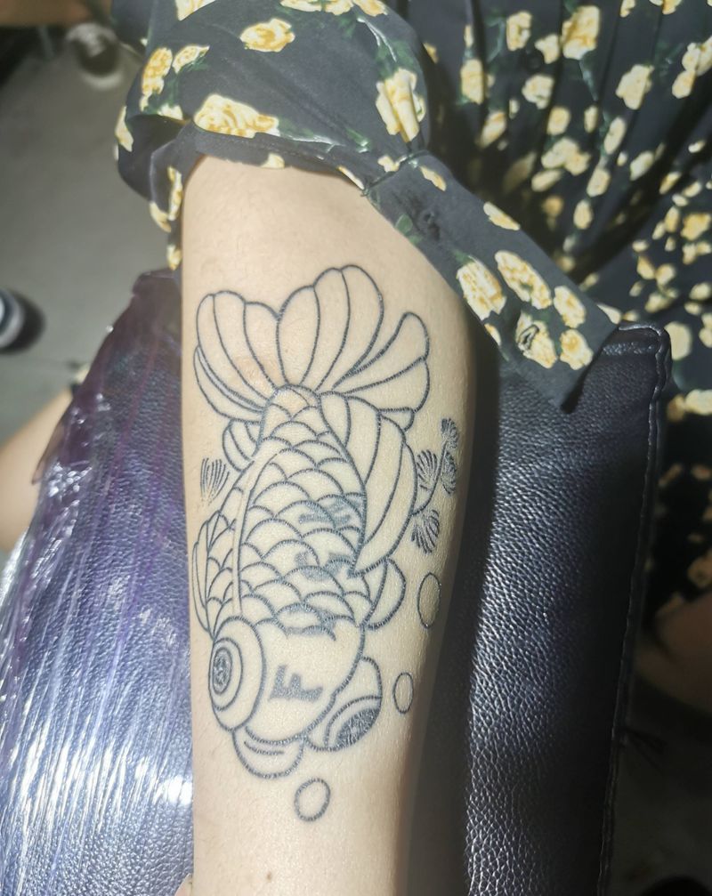 当前位置: 首页 >山东省济宁市纹身店-洪武刺青工作室纹身图案>金鱼遮盖纹身图片_手臂老传统纹身图案