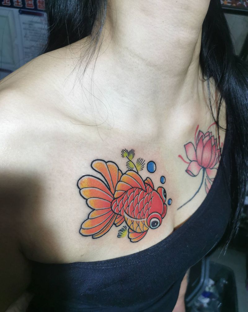 金鱼纹身图片_胸部新传统水彩纹身图案