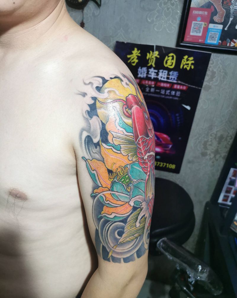 当前位置: 首页 >山东省济宁市纹身店-洪武刺青工作室纹身图案>大臂鲫鱼纹身图片_手臂新传统纹身图案
