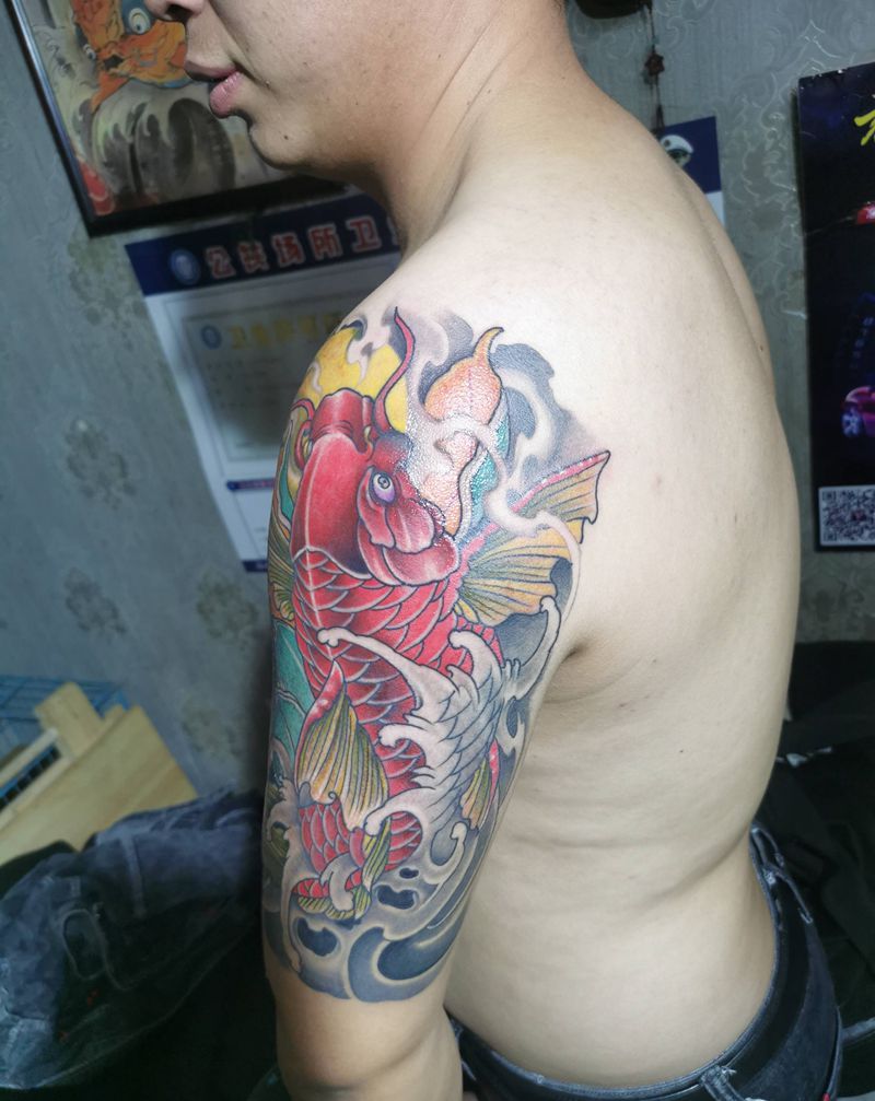 当前位置: 首页 >山东省济宁市纹身店-洪武刺青工作室纹身图案>大臂鲫鱼纹身图片_手臂新传统纹身图案