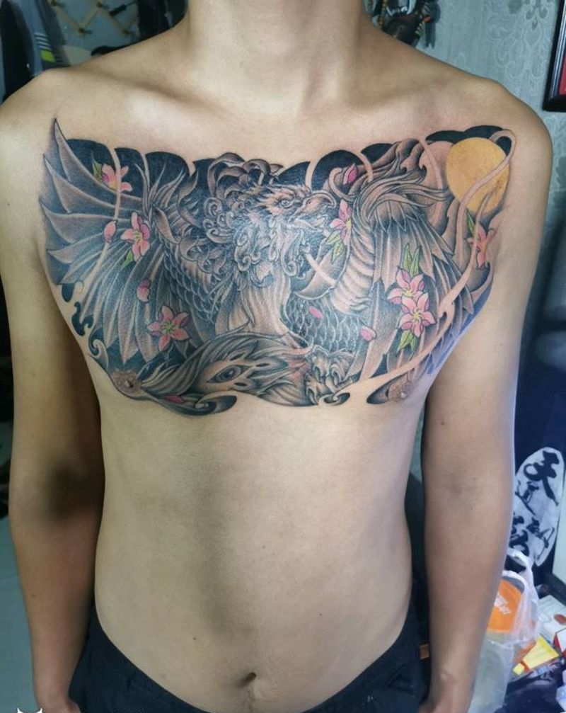 当前位置: 首页 >山东省济宁市纹身店-洪武刺青工作室纹身图案>花胸凤凰纹身图片_胸部纹身图案