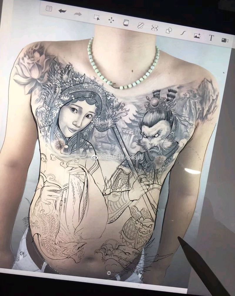 当前位置: 首页 >山东省济宁市纹身店-禅心刺青艺术空间纹身图案>通体之路纹身图片_胸部腹部新传统大圣花旦烈火风纹身图案