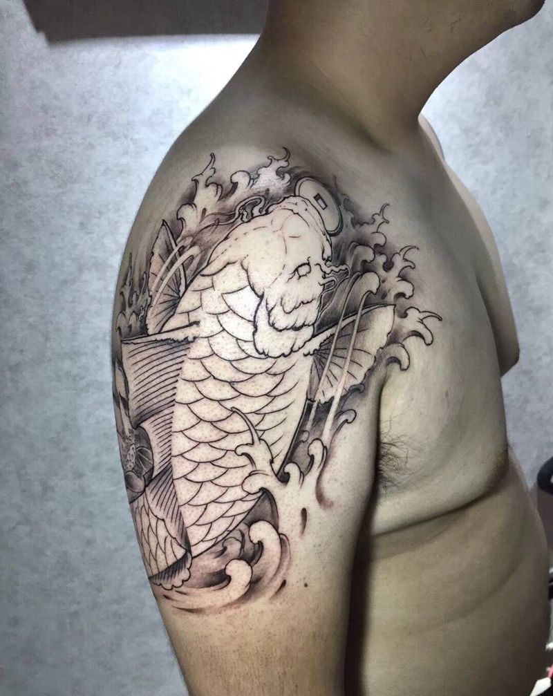 当前位置: 首页 >山东省济宁市纹身店-禅心刺青艺术空间纹身图案>招财富贵鱼纹身图片_手臂肩部新传统鱼招财荷花纹身图案