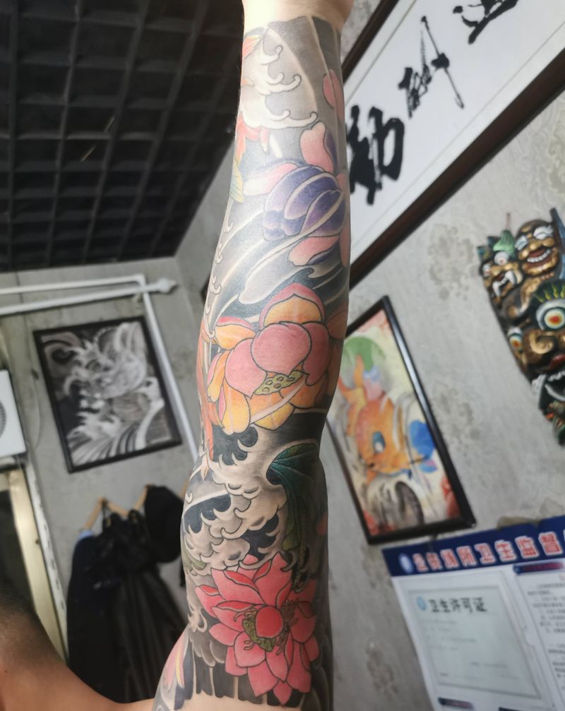 当前位置: 首页 >山东省济宁市纹身店-洪武刺青工作室纹身图案>鲫鱼莲花纹身纹身图片_新传统纹身图案