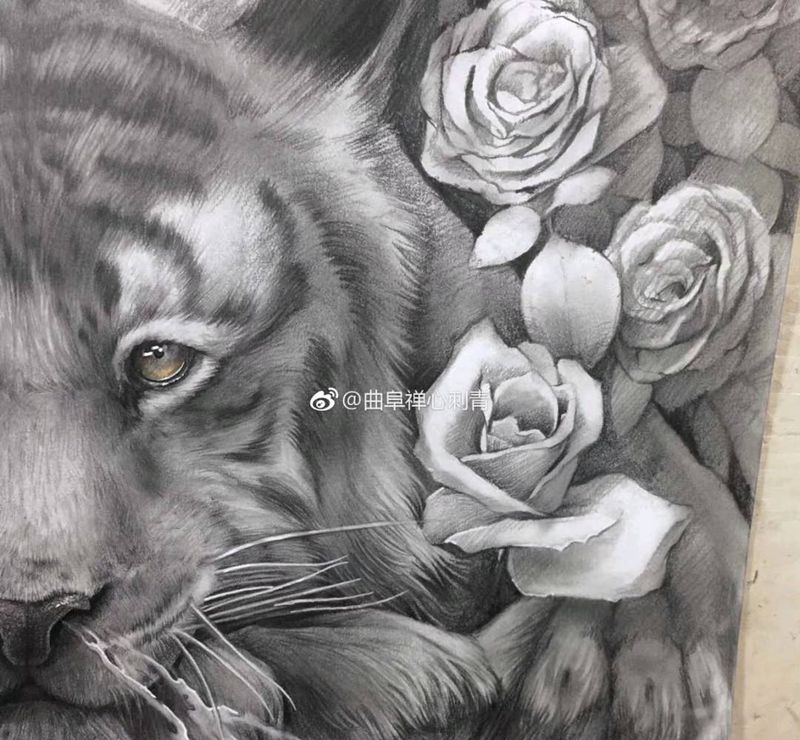 心有猛虎细嗅蔷薇纹身图片_胸部腹部欧美写实水墨老虎蔷薇花纹身图案