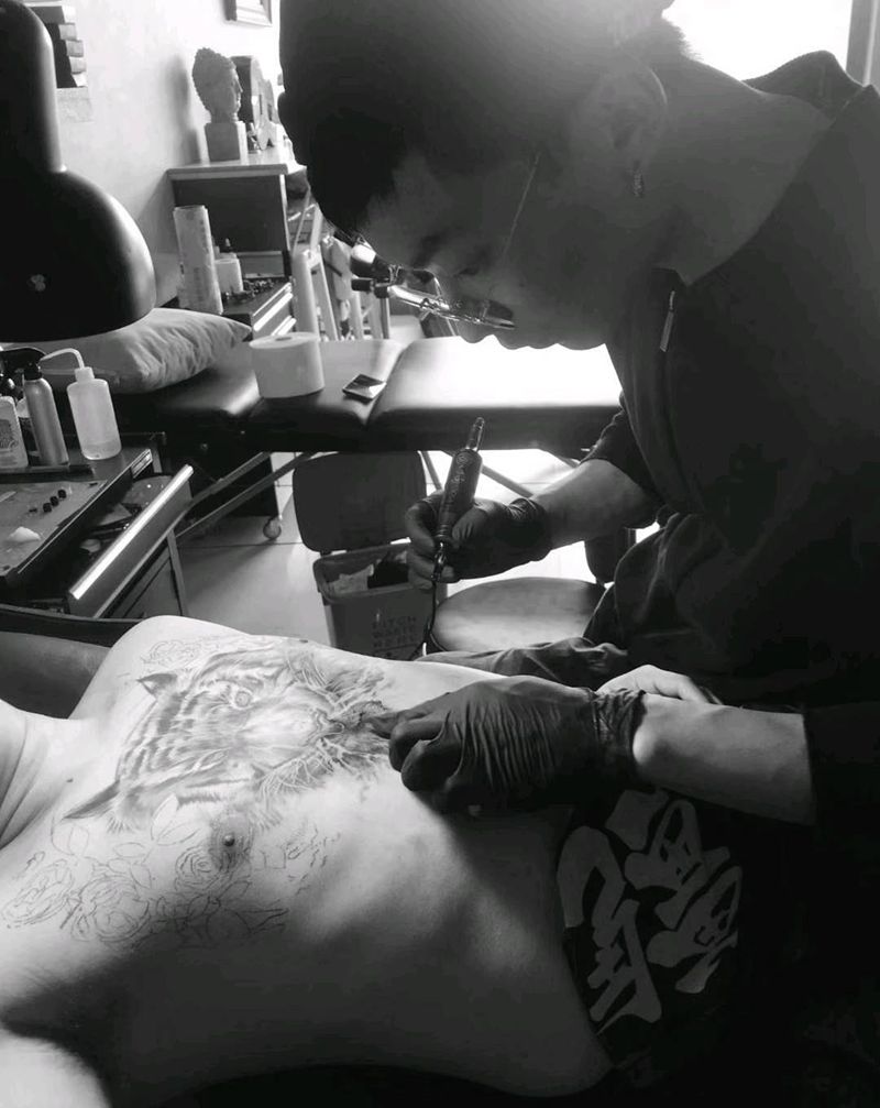 当前位置: 首页 >山东省济宁市纹身店-禅心刺青艺术空间纹身图案>心有猛虎细嗅蔷薇纹身图片_胸部腹部欧美写实水墨老虎蔷薇花纹身图案