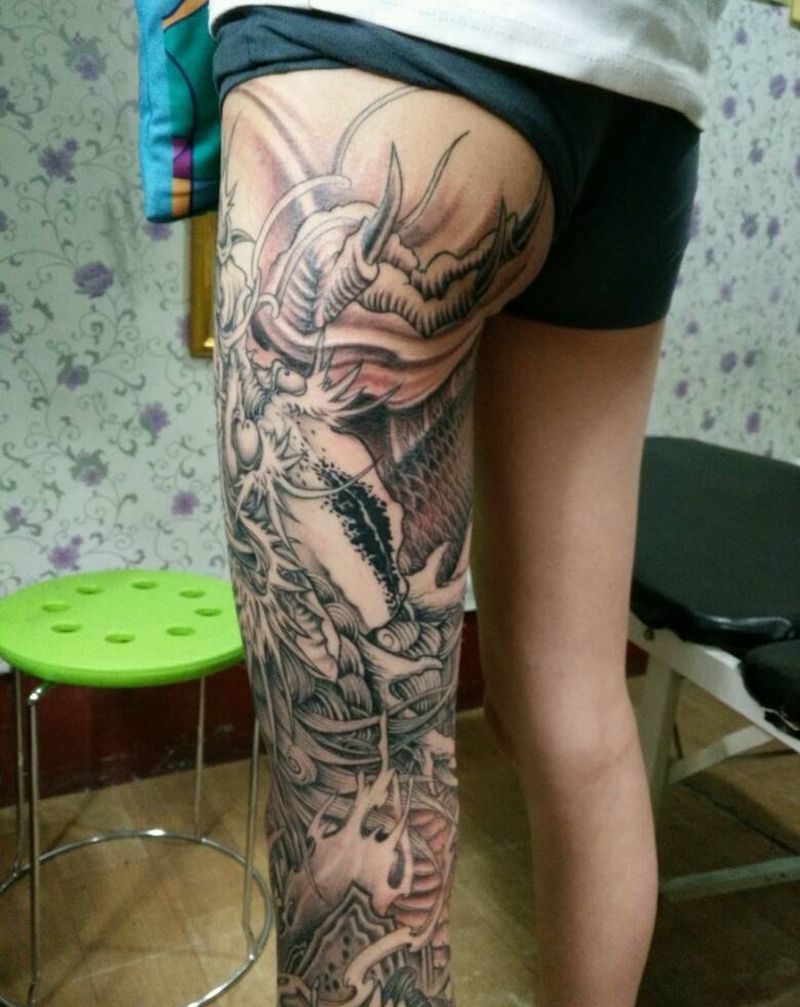 • T网红王老大花腿龙纹身图片_腿部新传统纹身图案