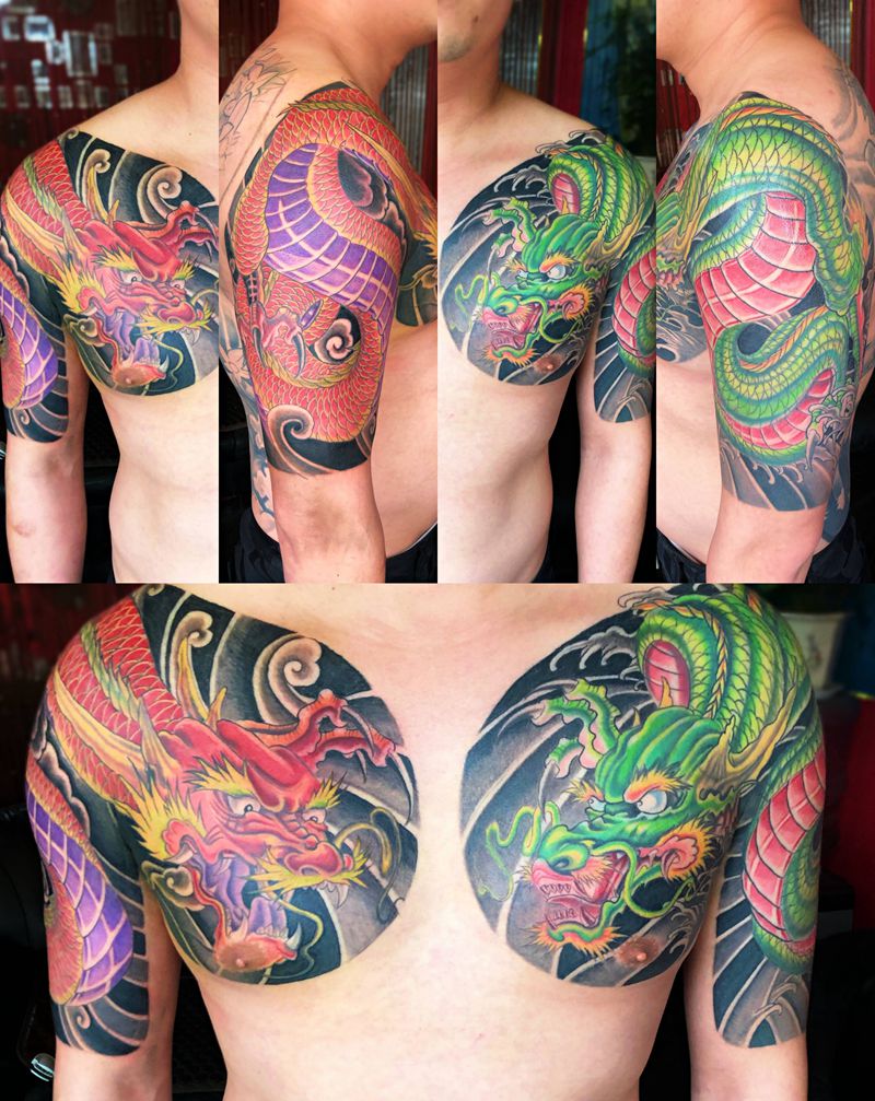 双龙半甲《旺师傅作品》纹身图片_胸部肩部老传统新传统龙半甲彩色纹身图案