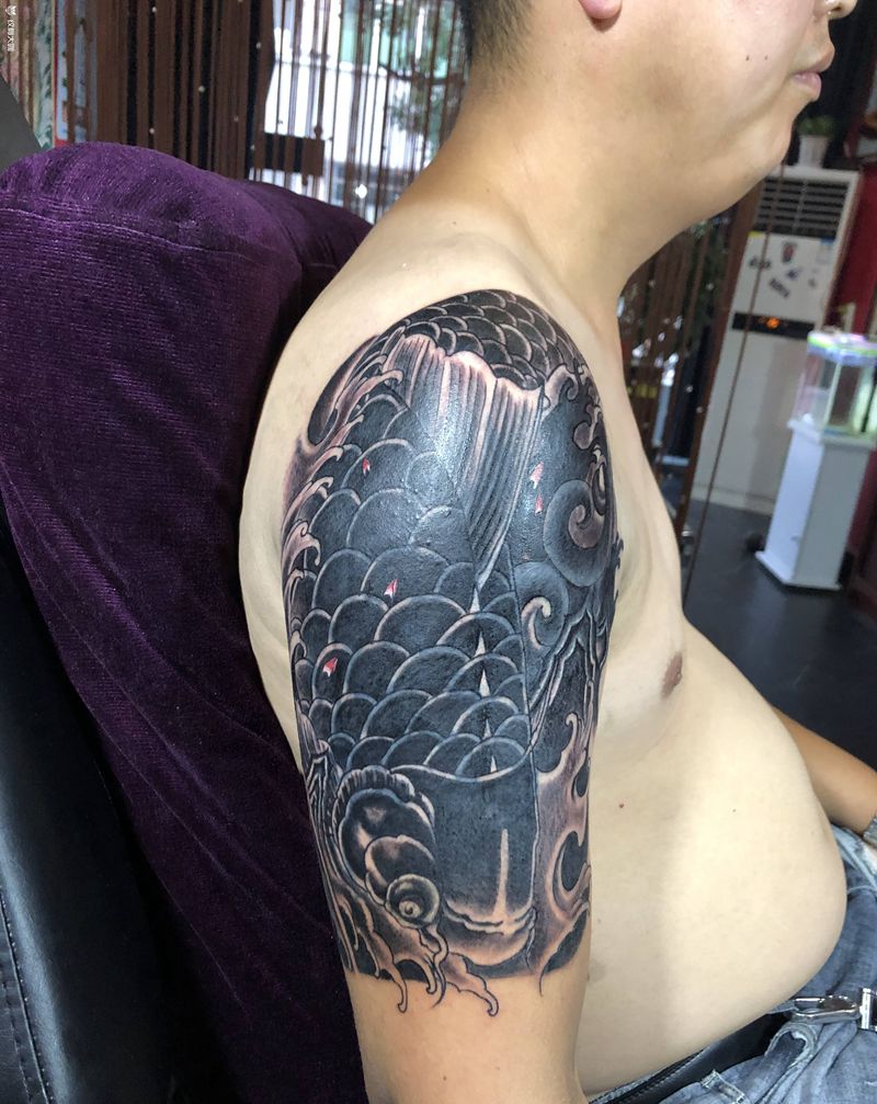 图腾遮盖(旺师傅作品)纹身图片_手臂肩部老传统图腾遮盖鱼纹身图案