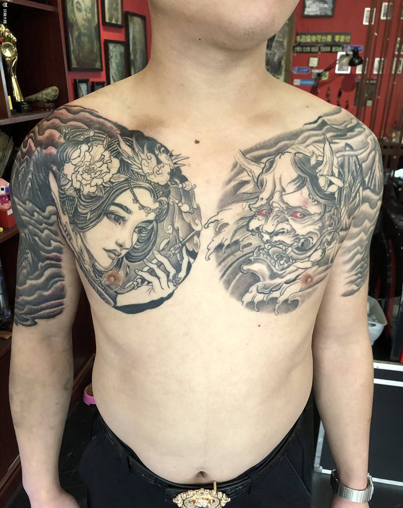 当前位置: 首页 >山东省泰安市纹身店-金门刺青(原欣文艺刺青)纹身图案>古风美女般若半甲《遮盖旺师傅》纹身图片_肩部胸部新传统艺伎般若半甲纹身图案