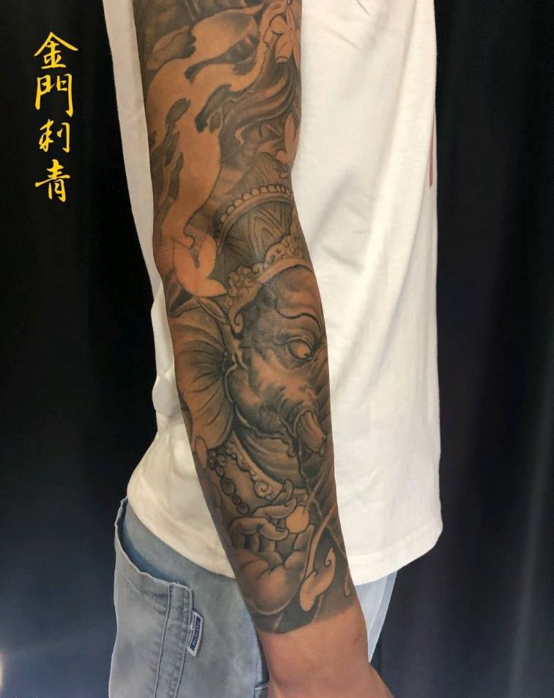 当前位置: 首页 >山东省泰安市纹身店-金门刺青(原欣文艺刺青)纹身图案>象神不动尊花臂《旺师傅作品》纹身图片_手臂肩部新传统象神不动冥王纹身图案