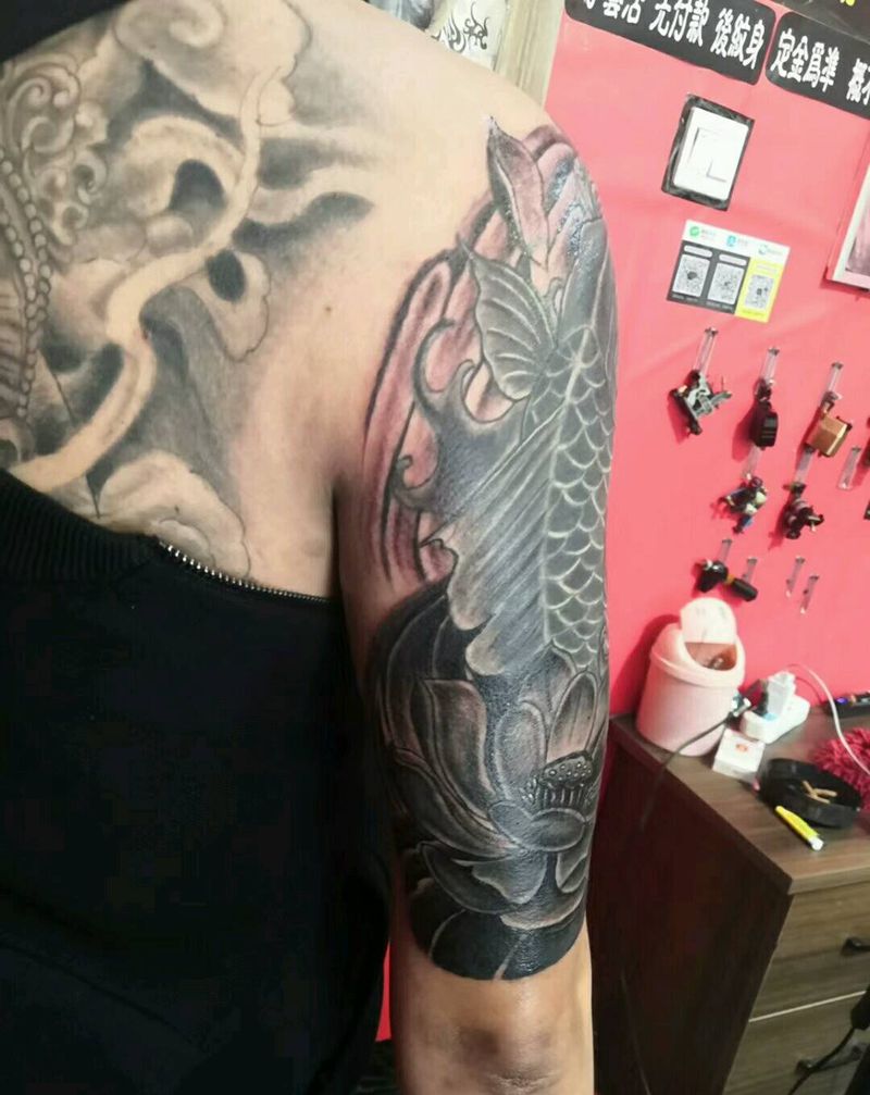 当前位置: 首页 >山东省泰安市纹身店-金门刺青(原欣文艺刺青)纹身图案>老纹身修改《旺师傅作品》纹身图片_手臂肩部老传统鱼遮盖修改纹身图案