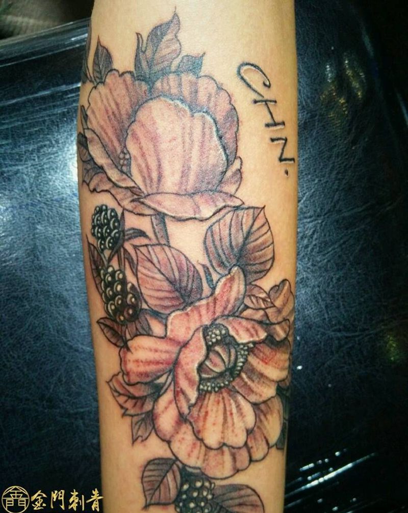 素花小作《旺师傅作品》纹身图片_手臂点刺素花点刺英文纹身图案
