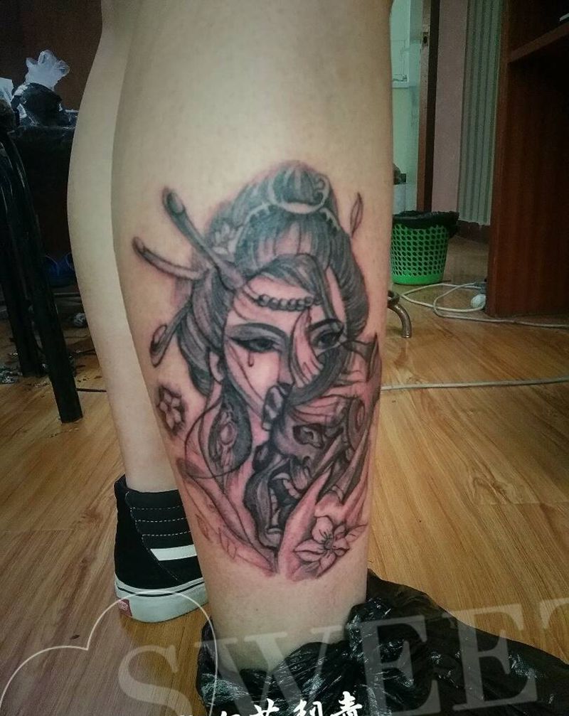 当前位置: 首页 >山东省泰安市纹身店-金门刺青(原欣文艺刺青)纹身图案>艺妓(小腿)纹身图片