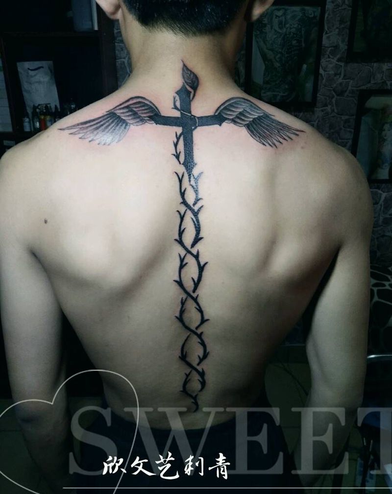 十字架翅膀纹身图片_背部图腾欧美写实十字架翅膀个性纹身图案