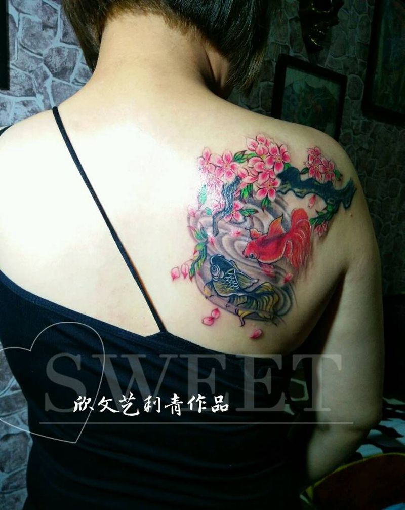金鱼戏水(遮盖)《旺哥作品》纹身图片_肩部老传统新传统金鱼纹身图案