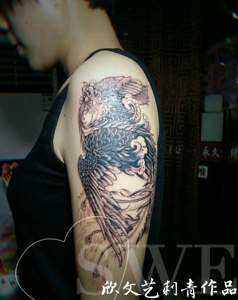 凤凰于飞(图腾遮盖)《旺哥作》纹身图片_手臂传统习俗动物宗教成品手稿纹身图案