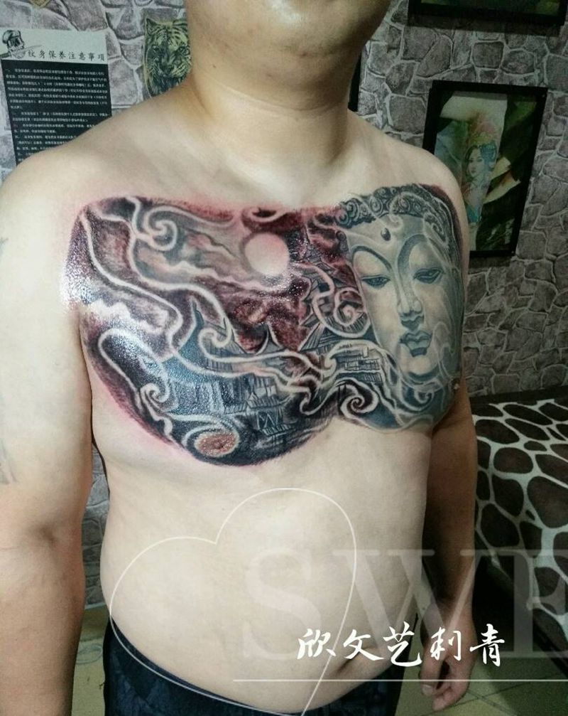 佛花胸《旺师傅作品》纹身图片_胸部老传统花胸佛塔纹身图案