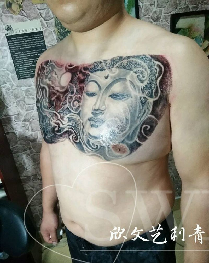 佛花胸《旺师傅作品》纹身图片_胸部老传统花胸佛塔纹身图案