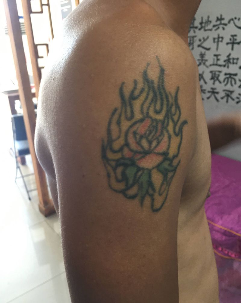 当前位置: 首页 >山东省威海市纹身店-齐刺青 工作室纹身图案>老图遮盖纹身图片_手臂老传统龙纹身图案