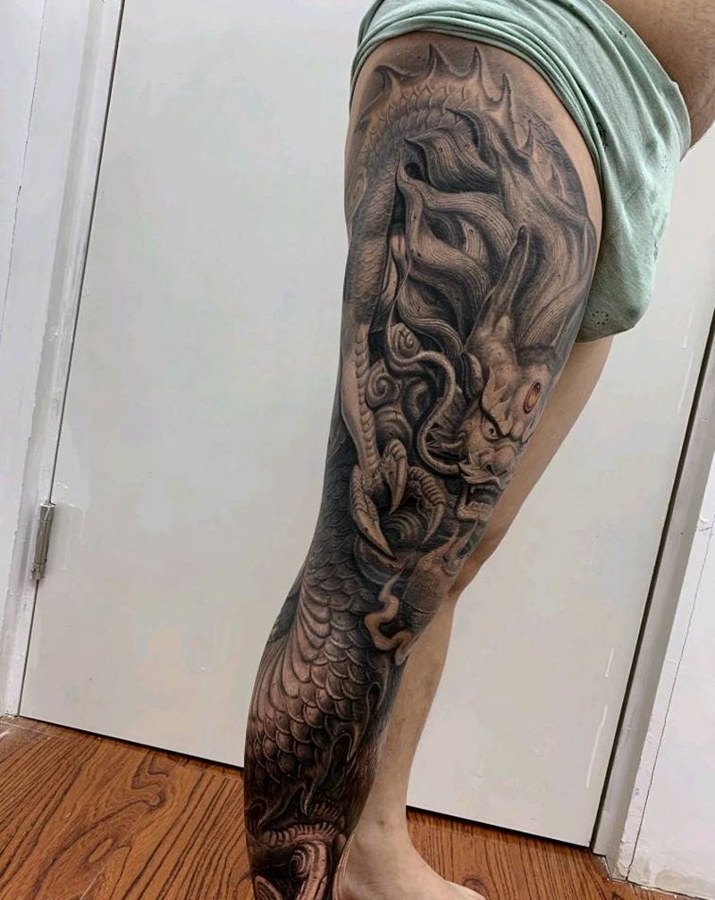 • T网红王老大花腿龙纹身图片_腿部新传统纹身图案