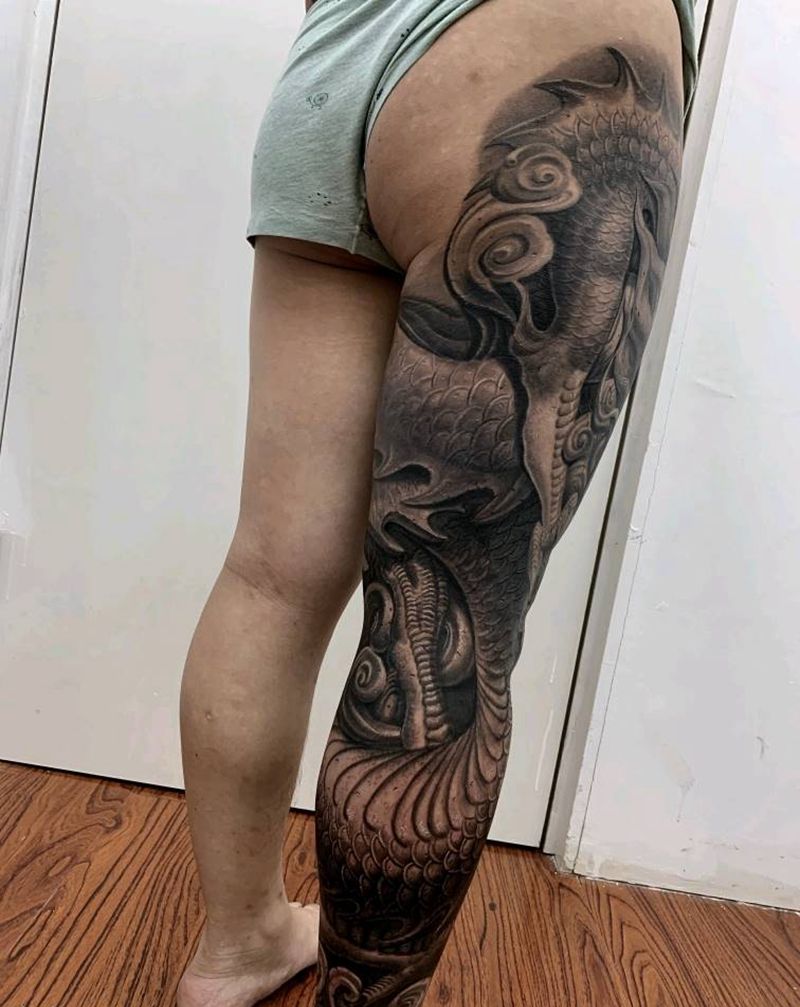 • T网红王老大花腿龙纹身图片_腿部新传统纹身图案