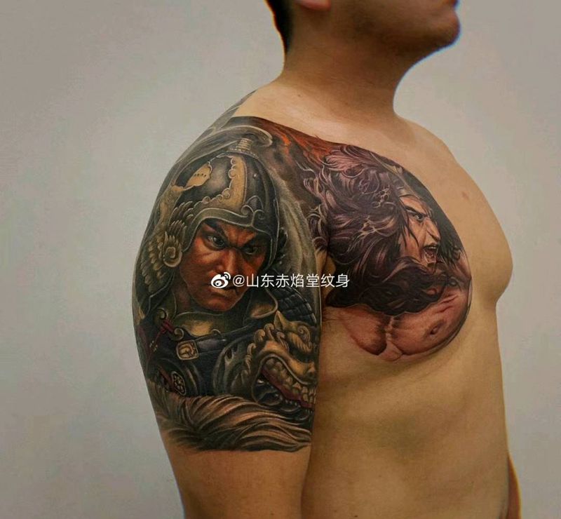 当前位置: 首页 >山东省济宁市纹身店-山东赤焰堂纹身纹身图案>彩色武将半甲纹身图片_手臂胸部纹身图案
