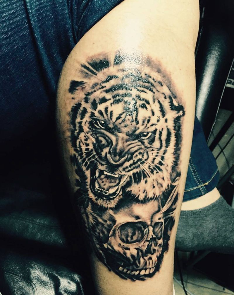 当前位置: 首页 >山东省泰安市纹身店-劫月刺青纹身图案>老虎骷髅纹身图片