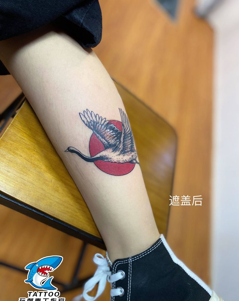 仙鹤遮盖纹身图片_腿部几何纹身图案