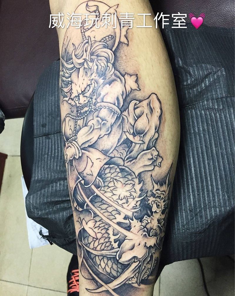 • T网红王老大花腿龙纹身图片_腿部新传统纹身图案