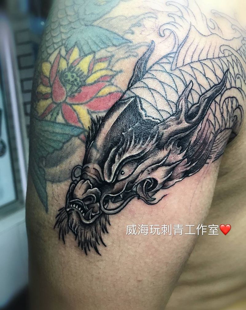 • T网红王老大花腿龙纹身图片_腿部新传统纹身图案