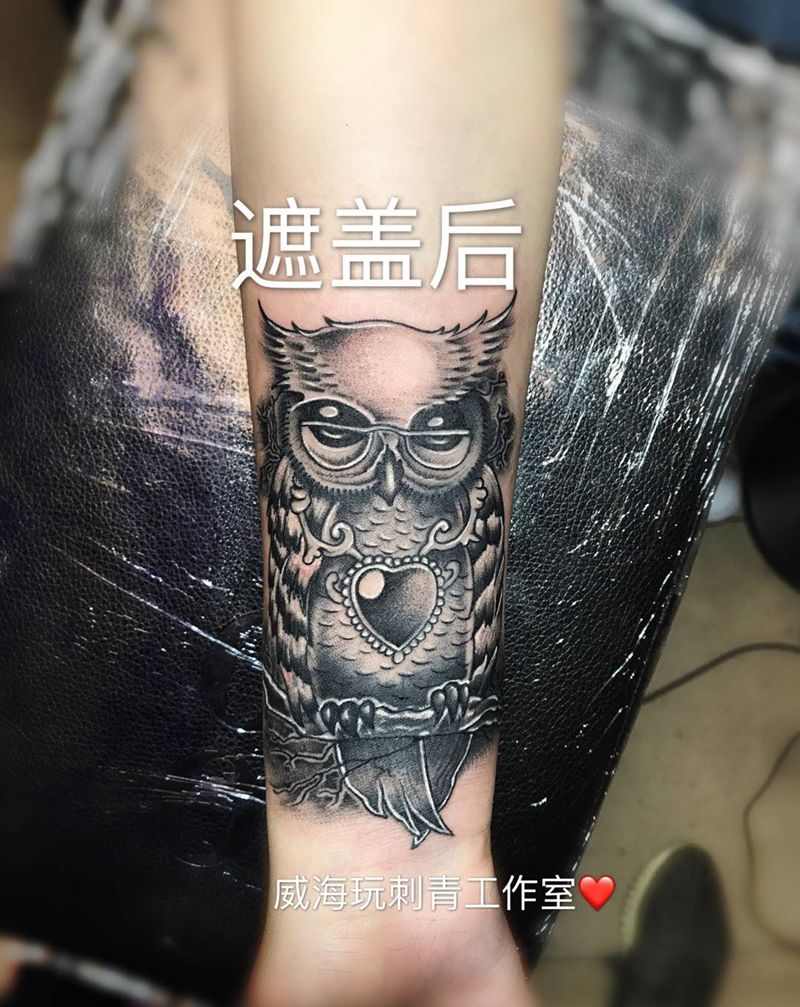当前位置: 首页 >山东省威海市纹身店-威海玩刺青工作室纹身图案>猫头鹰遮盖纹身图片