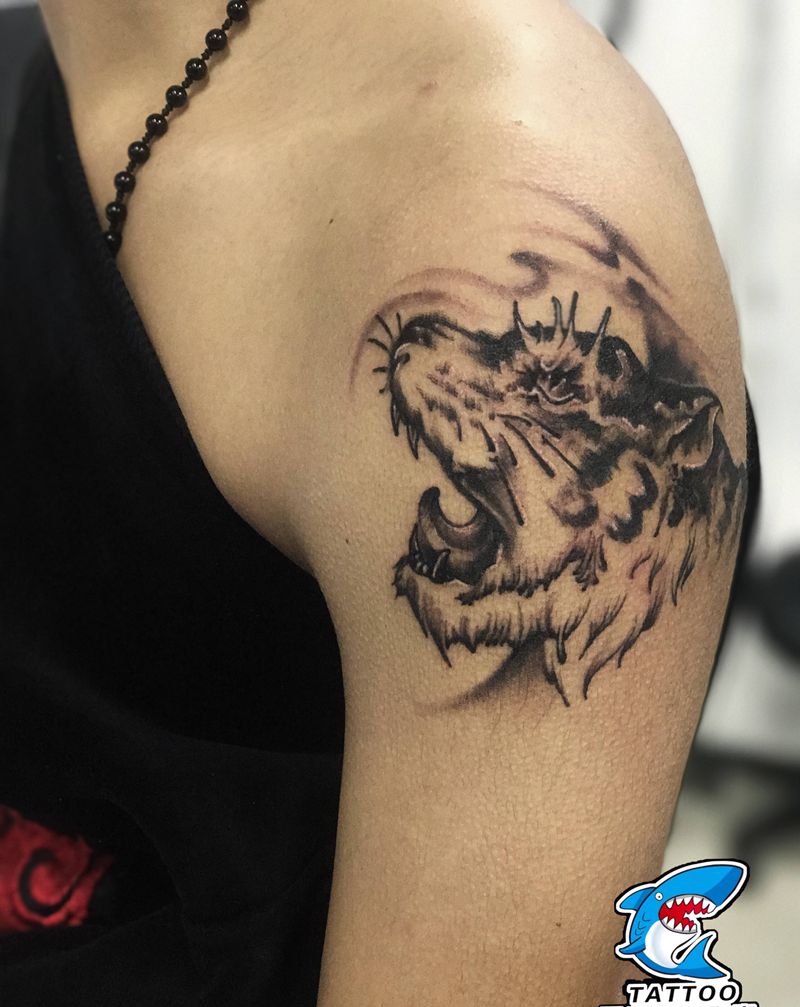 当前位置: 首页 >山东省威海市纹身店-威海玩刺青工作室纹身图案>局部虎头纹身图片_手臂新传统纹身图案