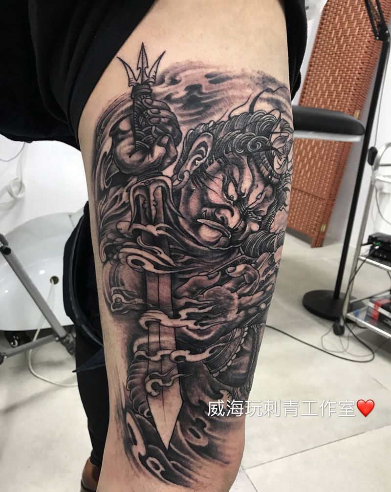 当前位置: 首页 >山东省威海市纹身店-威海玩刺青工作室纹身图案>大腿不动明王纹身图片_腿部新传统纹身图案